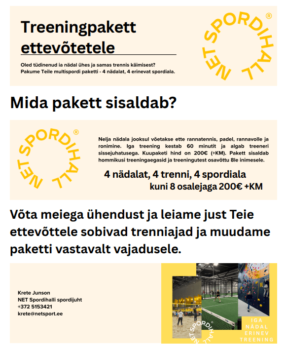 Soovime, et trennis käimine oleks mõnus ja meeltmööda tegevus kõigile. Seetõttu tulime välja treeningpaketiga, mis on kõike muud kui üksluine. Ettevõtete pakett on suunatud kontoriseltskondadele, kes tahaksid kord nädalas lõbusalt sportida ning nelja nädala jooksul proovida erinevaid spordialasid. Muidugi ei pea piirduma vaid ühe kuuga, vaid saab igal kuul uuele ringile minna! Sel viisil on oht suveks vormi saada. 😉